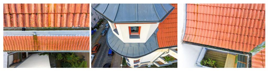 Nach dem das Laub von den Bäumen gefallen ist, haben viele Eigentümer eines Hauses oder einer Wohnungsanlage das gleiche Problem – ihre Dachrinnen sind verstopft, das Wasser fließt nicht mehr richtig ab und kann sich unter Umständen über die Hausfassade verteilen. Der Einsatz eines Industriekletterers ist sehr zeit- und kostenaufwendig. Mit unserer vom Boden aus gesteuerten Kamera-Drohne mit Livebild-Übertragung können wir in kürzester Zeit die Problemstellen erfassen. Es gibt dabei nahezu keine Einsatzgebiete, die unmöglich sind. Falls Sie Fragen zu unseren Referenzobjekten in den Bereichen Dach und Dachrinnen haben, freuen wir uns auf Ihre Anfrage. Gern erstellen wir Ihnen ein unverbindliches Angebot.